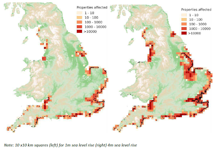 According to the committee’s climate change risk assessment it is almost certain that England will have to adapt to at least one metre of sea level rise. Modelling studies have shown that flooding increases exponentially with rising sea levels. So for coastal areas subject to flooding it is not sufficient to increase the height of sea walls in line with sea level rise.